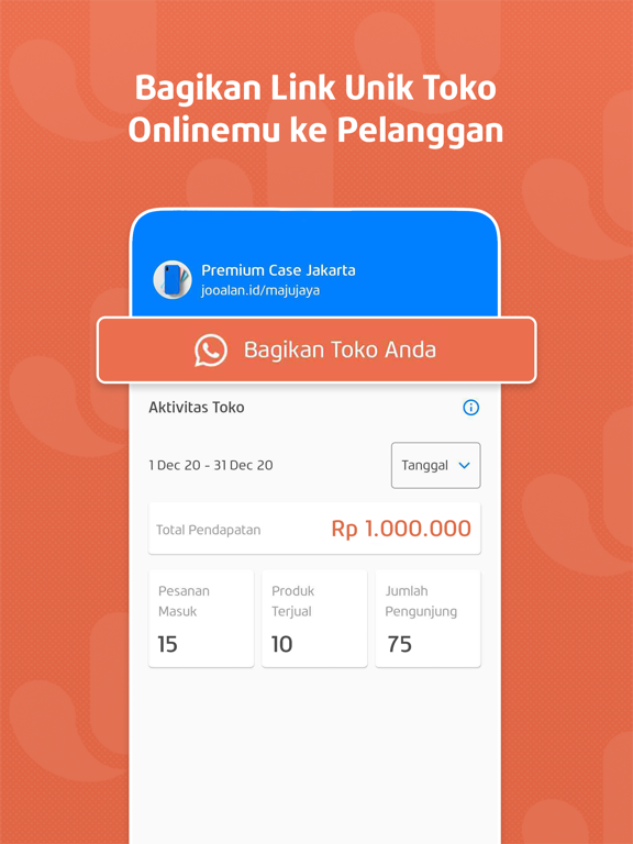 Dengan Jooalan, kamu bisa mulai jualan secara online, membuat katalog produk, dan bagikan link online shop / toko online kamu melalui WhatsApp ataupun sosial media lainnya. Mulai jualan hingga kelola pesanan toko online kamu lebih mudah, dimana saja dan kapan saja dengan menggunakan Jooalan. Tanpa biaya atau potongan komisi apapun! Kamu juga gak perlu beli hosting dan domain untuk mulai jualan online.