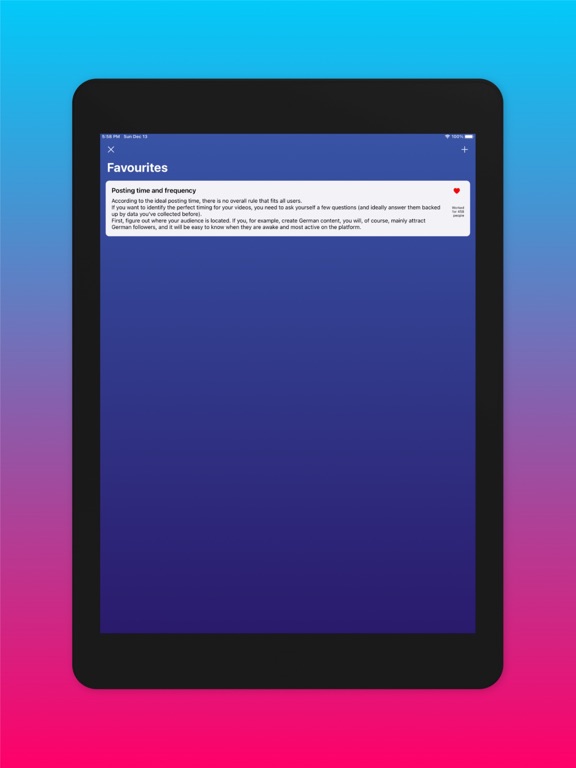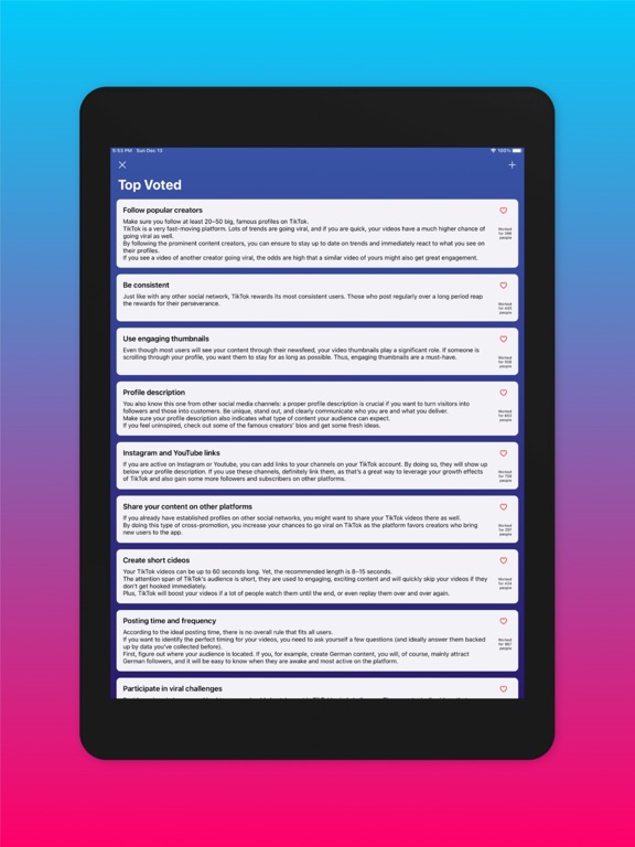TTop can help you master TikTok with real advice and tips, ranked by a vibrant community of TikTokers. The app shows tips ordered by popularity, allowing you to improve your videos, artistic effects, posting patterns and the way you engage with your followers. The app allows you to submit your own tips, provide feedback for other people's tips, mark if they have worked for you, and build your own list of most liked ideas and tips. To support the development of the app and maintenance of the platform, the app also includes a handy AI-based video hashtag generator that can help you quickly prepare hashtags for your video posts.