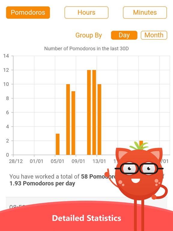 Pomodoro Hero will keep track of your completed sessions so you can analyse these later in an easy way with our built-in charts