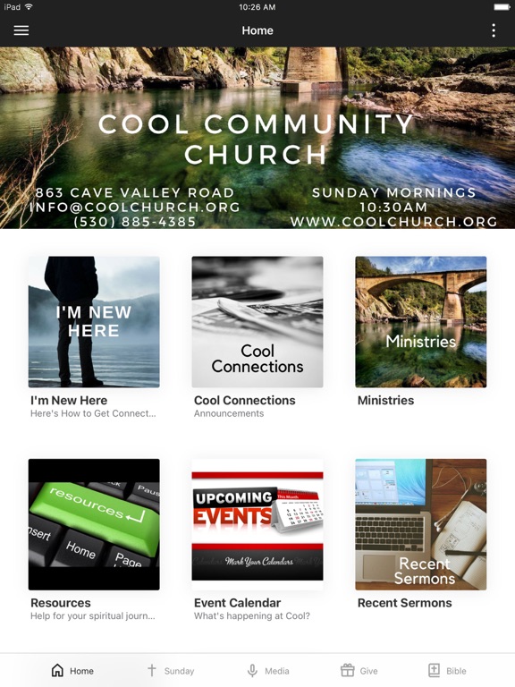 This app will help you stay connected with the day-to-day life of Cool Community Church. With this app you can: - Watch or listen to past messages - Stay up to date with push notifications - Share your favorite messages via Twitter, Facebook, or email - Download messages for offline listening