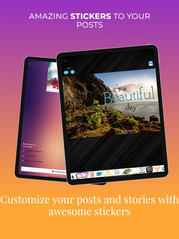 - Add text, captions and Stickers! Boost your list of followers by adding stickers to your posts and go viral with your awesome images.