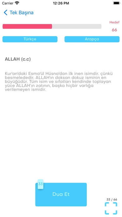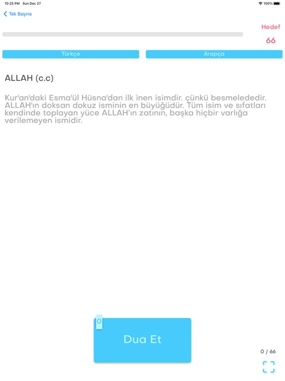 10- Ana ekranda "Hedef" ve "Okunan" diye iki değer bulunmakta olup belirlediğiniz zikir hedefine ulaştığınızda titreşim özelliği sayesinde sizi uyarır. Zikir Listesinde "Toplam" diye de bir üçüncü alan bulunmaktadır. "Toplam" değerini örnekle açıklamak gerekirse: Subhan'Allāh zikrini 70.000 defa çekmek istiyorsunuz ve kendinize günlük 100 tane hedef koydunuz, siz günlük hedefinize her ulaştığınızda "Okunan" değeri sıfırlanacak fakat "Toplam" değeriniz artmaya devam edecektir.