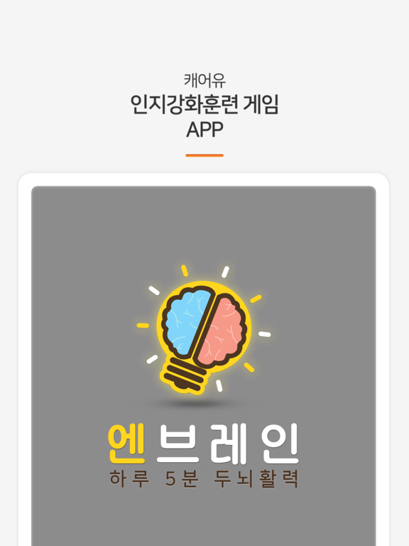 인지력 향상을 위한 두뇌 체조 프로그램, 매일 5분간 두뇌 운동으로 치매를 예방하세요! 인지강화훈련 게임 순발력, 판단력, 기억력, 사고력, 집중력 등 5가지 두뇌 인지 영역 약 20종의 게임으로 치매예방 및 인지강화훈련을 해보세요. 훈련 기록 확인 모든 훈련 데이터가 누적되며, 부족한 인지 영역 확인 가능 기록보기로 부족한 인지 영역에 대한 훈련을 해보세요. 레벨에 따른 난이도 조절 1레벨부터 30레벨까지 난이도에 따라 훈련 강도가 높아집니다. 특정 인지 영역에서 지속적인 훈련으로 효과를 높이세요. 오늘의 미션 매일 새로운 미션이 생성 됩니다. 매일 접속해서 인지강화훈련을 해야 효과가 높아집니다. 통합 분석 리포트 제공 엔브레인 플랫폼에서 통합 분석 리포트 제공 엔브레인+정신건강테스트 등 모든 데이터를 한 곳에서 확인 가능 합니다. 엔브레인 플랫폼 : www.enbrain.kr