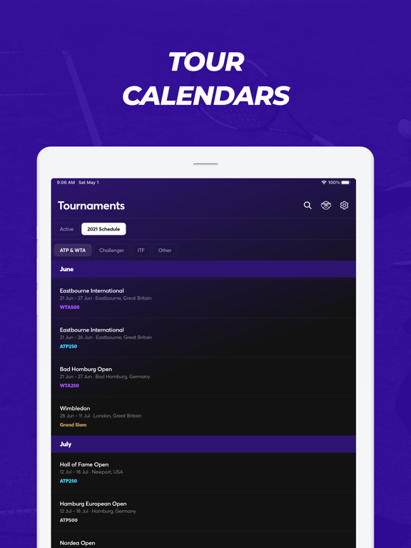 One place for all Grand Slam, ATP World Tour, WTA, ATP Challenger and ITF Tour events.