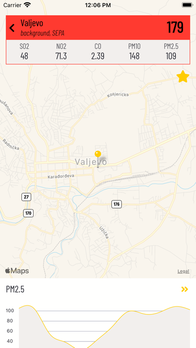 - biranje jedne ili više omiljenih lokacija, kako bi se u listi prikazale poslednje izmerene vrednosti za SO2, NO2, O3, CO, PM10, PM2.5