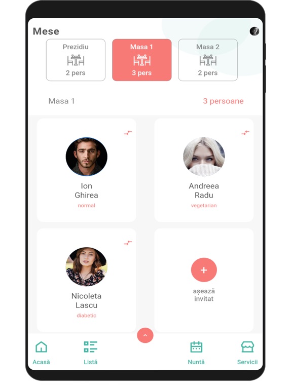 - Așezarea la masă: e acum simplă. Mută invitații la masă cu un click.