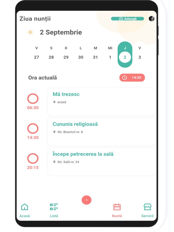 - Ziua nunții: planifică fiecare moment al zilei din timp. Creează orar perfect pentru ziua ta. Știi exact unde trebuie să fii și la ce oră!
