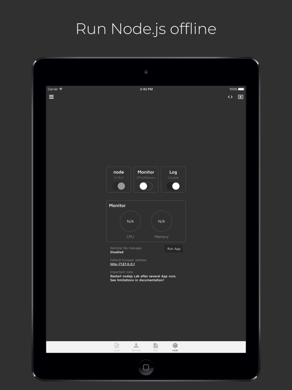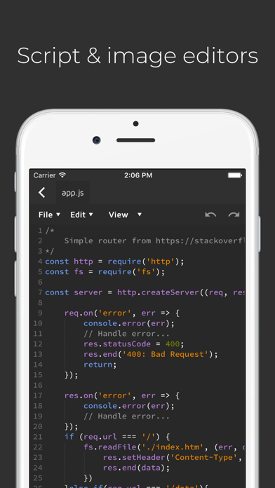 Nodejs Lab also turns your device into a complete standalone web application with nodejs support (very similar to nw.js)