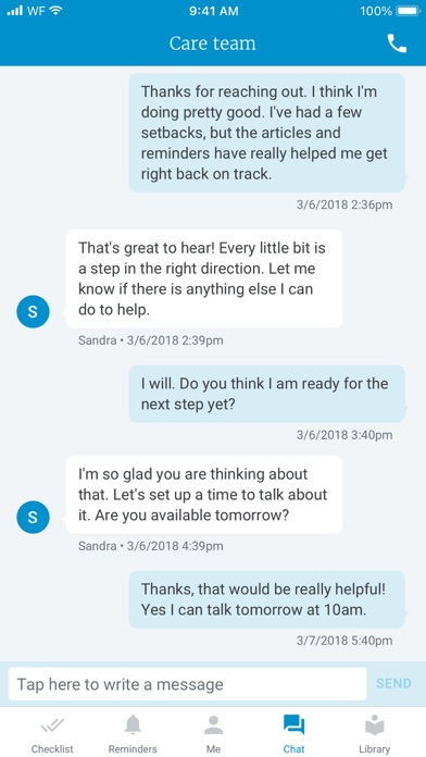 To get started, your Care Team will send you an access code. Once you’re set up, you’ll be able to send a message whenever you want personalized help managing your health. On the app you’ll also find helpful articles and videos that are relevant to you.