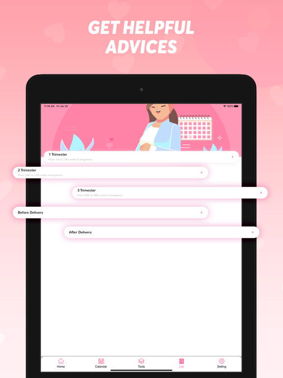 - Checklist for each trimester, to-do lists can be edited for every 3 months of the trimester.