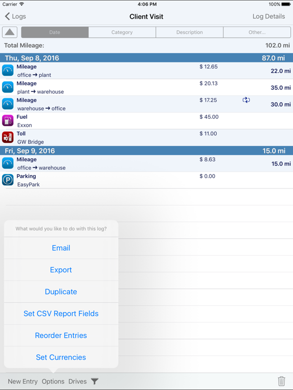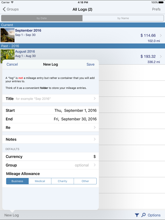 1. LIVE mileage tracking - the app will track your every move via GPS. This feature requires you to tell the app when you start and stop.