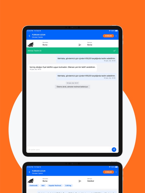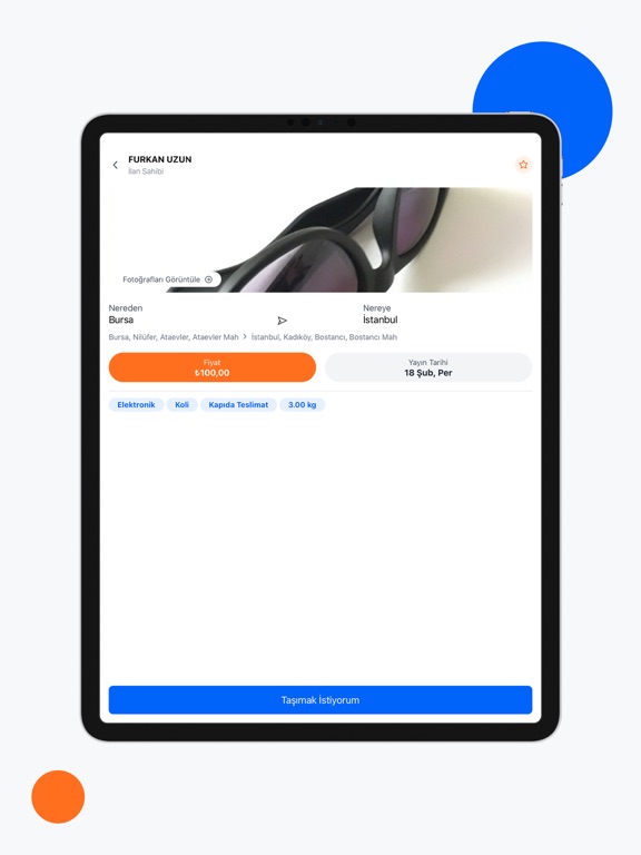 Gönderici olarak; ürünün temel boyut bilgilerini gir, resmini çek, zaman aralığını belirle, vermek istediğin rakamı gir ve teklifleri bekle.