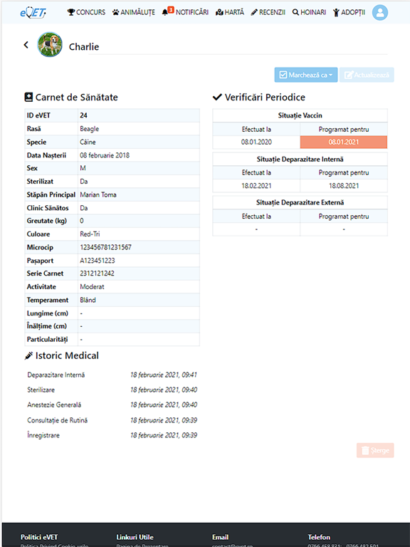 disponibilitatea datelor privind verificările medicale periodice (ultimul și următorul vaccin programat, deparazitare internă/externă, analiză de laborator efectuată) plus notificarea în cazul expirării acestora;