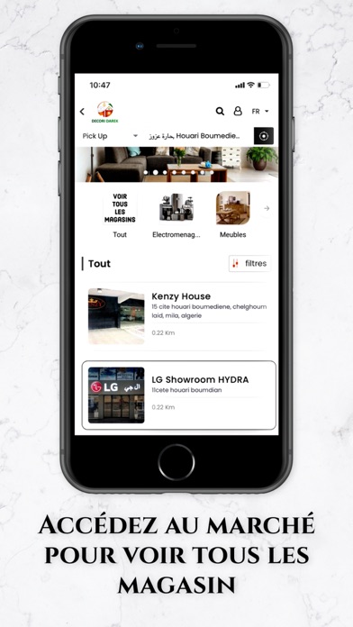 Decori Darek est une plate-forme algérienne (site Web, application iOS) pour répertorier l'inventaire de tous les articles liés à l'ameublement, aux appareils électroménagers, aux lustres, aux équipements sportifs, aux tapis, aux articles de décoration, aux portes, aux ustensiles de cuisine, et bien plus encore. Propulsé par la technologie de géolocalisation, tout en recherchant des articles, Decori Darek vous montrera le magasin le plus proche qui a votre article. Économisez du temps, de l'énergie et de l'argent en utilisant notre plate-forme, dans le confort de votre propre maison, commencez à rechercher et à comparer les prix.