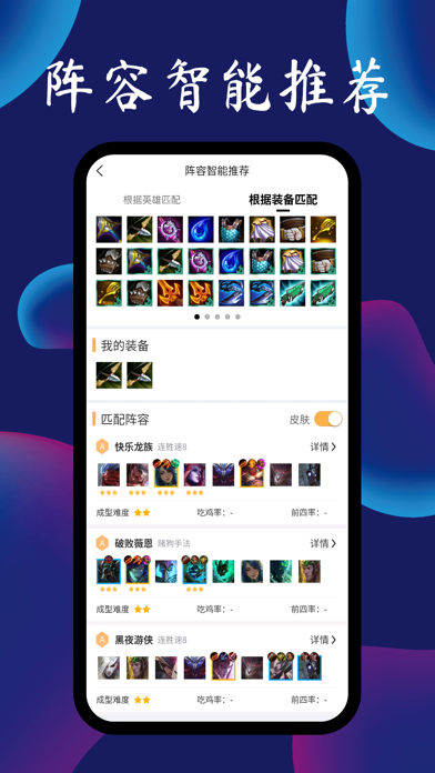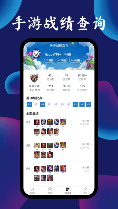 TFT云顶攻略助手!用手机可轻松查询最新热门阵容攻略,装备羁绊数据,外服手游战绩等,还有阵容智能推荐,助你轻松上分,玩转云顶! 【核心功能】 · 最新热门阵容:阵容评级,阵容站位,阵容过渡,详细攻略轻松掌握 · 阵容智能推荐:根据你场上的英雄和装备,智能为你匹配最合适的阵容 · 游戏数据查询:英雄装备数据、评级,羁绊职业数据,天选概率等各种数据一应俱全 · 模拟阵容站位:模拟排兵布阵,组成羁绊,创建属于自己的阵容 · 外服手游战绩:实时查看外服手游战绩,轻松掌握对局信息 · 手游世界排行:轻松查询世界前100名的大神数据,学习阵容助力上分。