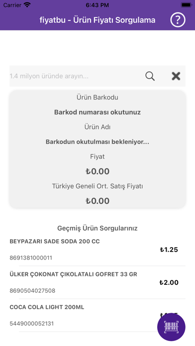 fiyatbu barkod okuyucu uygulaması ile 1.4 milyondan fazla barkodlu ürün için sorgulama yapabilirsiniz. Market, kırtasiye, züccaciye, petshop, aktar ve daha birçok işletme ürünleri için sorgulama yapabilirsiniz. Aynı zamanda sorguladığınız ürünün anlık olarak Türkiye'de farklı iller ile Türkiye geneli ortalama satış fiyatını görüntüleyebilirsiniz.