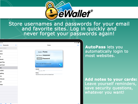 Lock your passwords, credit cards and bank account numbers behind military-grade encryption and carry them with you wherever you go by installing the most sophisticated and easy to-use password manager app on your iPhone, iPad and iPod touch. Stay safe, stay strong, stay smart with the universal iOS / iPadOS app, eWallet®.