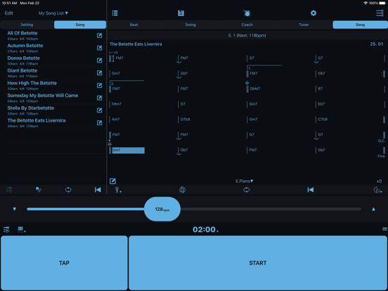• Song Player—Create chord progression by typing chord name and play along with the metronome.