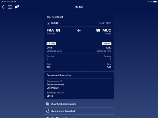 As the ideal travelling companion, the personal Travel Assistant shows you all the important information about your flight in compact form on one page. You will also receive direct notification of any information updates, such as boarding gate changes, via push message.