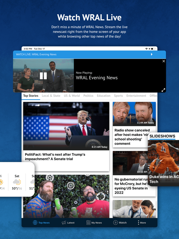 The all-new WRAL News App delivers coverage you can count on in Raleigh, Durham and Fayetteville, NC. Follow breaking news from North Carolina's largest news team and most experienced severe weather team.