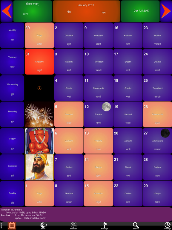 For every year, our panchang contains more than 340 important date of events and holy festivals in India. It reflects India's culture through the Hindu, Muslim, Sikh, Christian and civil festivals happening all along the year. Nearly all the festivals are illustrated with a colorful image.