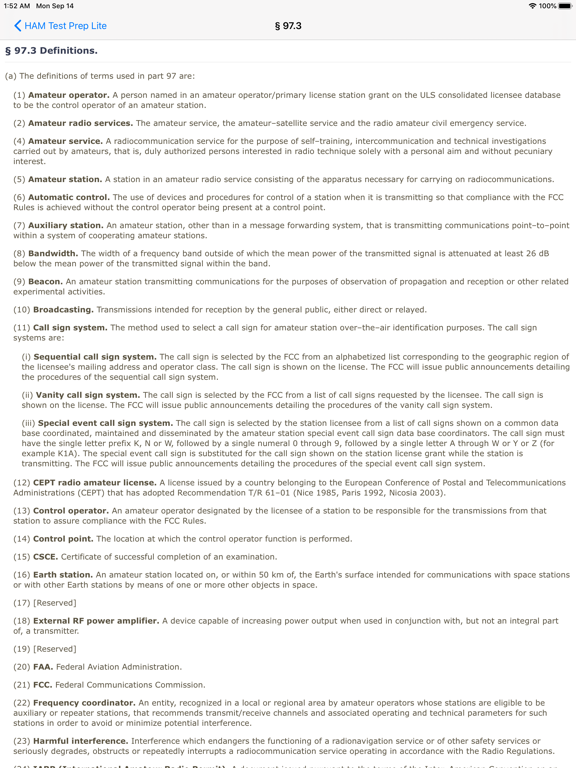 FCC rule text is viewable within the application. All sections can be browsed from the main screen. Additionally, for questions where rule sections have been identified, the rule text can be viewed on the question screen when studying the question pool or reviewing test results.