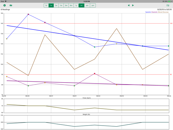 iBP uses color icons to indicate when your blood pressure values are normal, high, or hypertension. It also provides interactive graphs that allow you to display your values by weeks, months, year and time of day. The graphs display lows, highs, averages, and trend lines using statistical analysis.