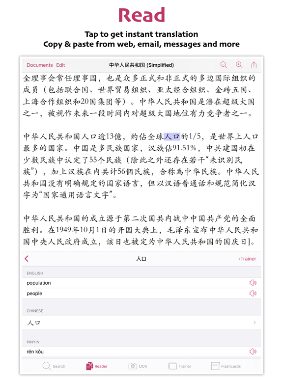 Reader: Import Chinese texts and get with a single tap translations of unknown words and characters.