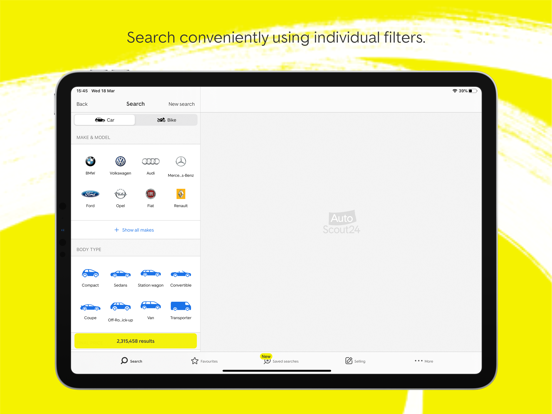 AutoScout24 is the largest online marketplace for cars in Europe and offers about 2 million vehicles. With the AutoScout24 app you can access the online car and motorbike marketplace anytime from anywhere.