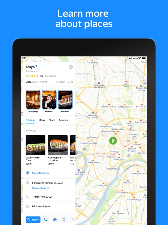 Search for an address or the best places nearby both online and offline. Yandex.Maps provides information about organizations and helps you reach your destination by car, public transport, bike, or on foot based on current traffic conditions.