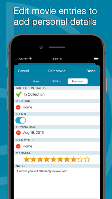 * Edit movie entries to add more details, like location, owner, notes, rating, etc.