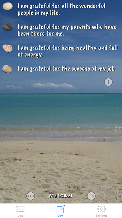 For each day, each text entry is preceded by an image of a Gratitude Rock. Multiple sentences can be entered per entry. Text is entered on top of the image of the ocean or any picture you choose.