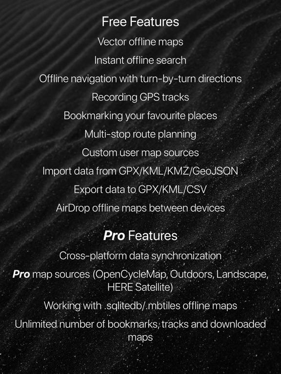 Subscription allows you to create unlimited bookmarks and record unlimited GPS tracks, download unlimited maps, sync between devices, use Pro map sources and import offline raster maps in sqlitedb/mbtiles format.