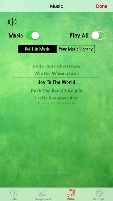 • Select one of 8 holiday background musical soundtracks. Select one or automatically play all the songs in a repeating sequence. Select Airplay to play the music to your Apple TV.