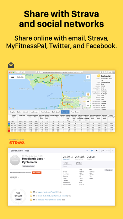 • Share by email, Twitter, Facebook, Strava, or MyFitnessPal.