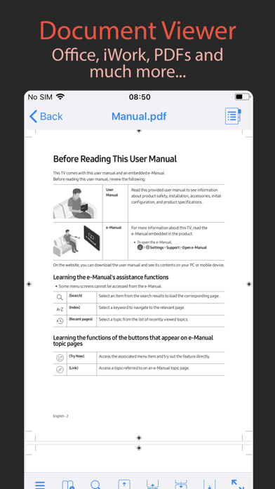 View Microsoft Office, Apple Pages, Numbers, KeyNote, PDF, text files, source code, HTML, and many more using the built-in viewers.