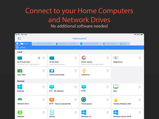 Try FileBrowserGO and let it change the way you use your iPad or iPhone to connect to your home computers, network drives and cloud storage.