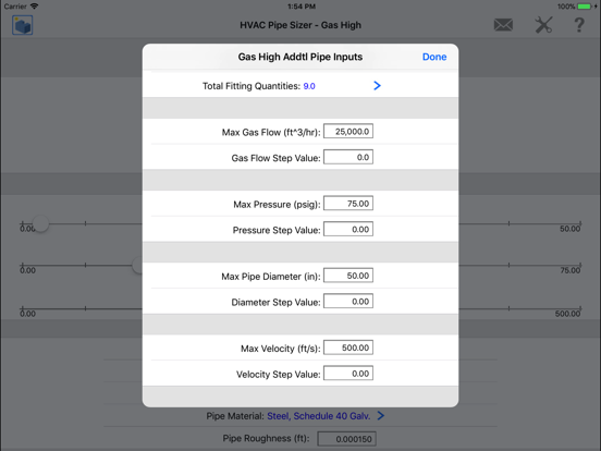This application includes built-in pipe fitting equivalent length and nominal pipe sizing tables for a wide variety of pipe material types and diameters.