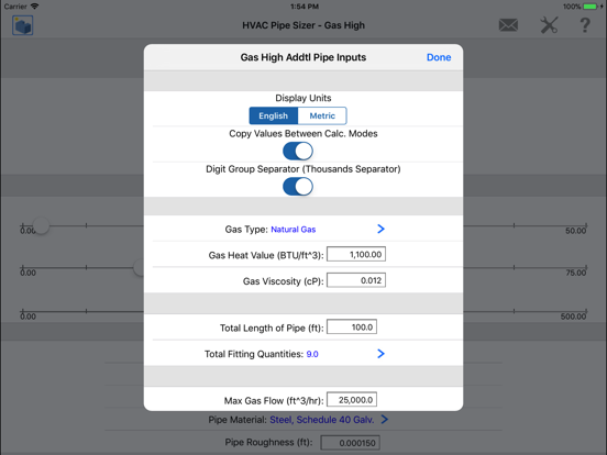 You can specify additional parameters such as the type of gas, various properties of the gas, the pipe material type, the total length of pipe, quantities for up to 11 different types of pipe fittings, and much more. You can also choose to display values in either english or metric units.