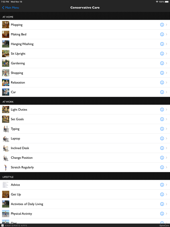 iSpineCare is an information resource for spine anatomy, function and disease. It is a presentation library of anatomical visualizations, spine pathologies, medical images and educational notes. Whilst this app is primarily for clinicians providing patient education, it can also be useful to anyone who wants to know more about spine health.