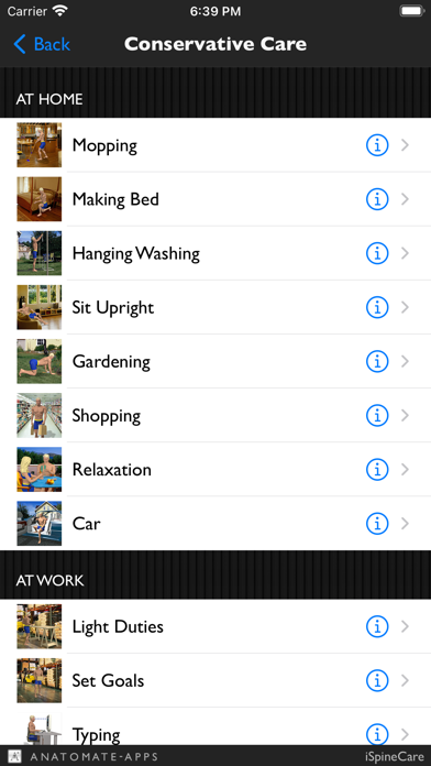 • Conservative Care videos with audio that cover basic back care education principles – lying, sitting, standing, lifting, shopping, gardening, physical activity, diet, smoking etc.