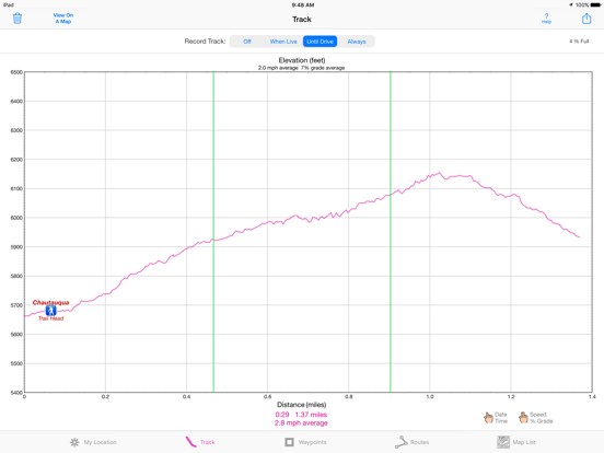 Show an elevation graph of your track or a route with altitude data. View date, time, average speed and % grade of track points. Measure the area inside a closed path.