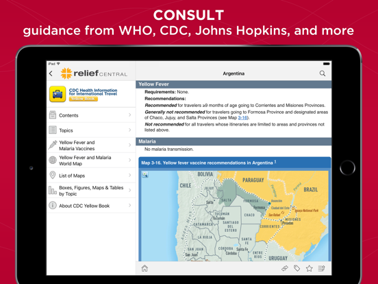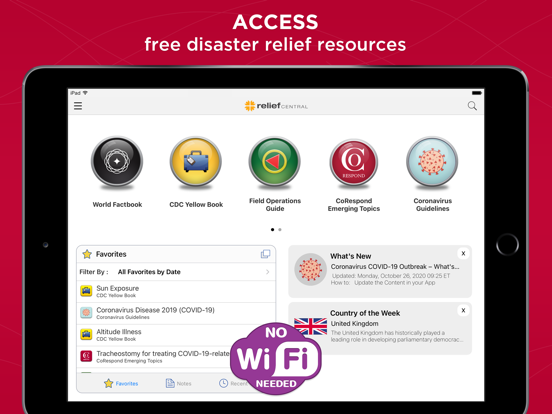 Relief Central is a free mobile and web resource developed by staff and friends of Unbound Medicine. It includes the latest versions of The World Factbook from the CIA, CDC Health Information for International Travel (The Yellow Book), Coronavirus (COVID-19) Guidelines, the Field Operations Guide from USAID, Prime PubMed Search, and Relief News from the Red Cross, United Nations, US Centers for Disease Control, CDC, FEMA, and more.