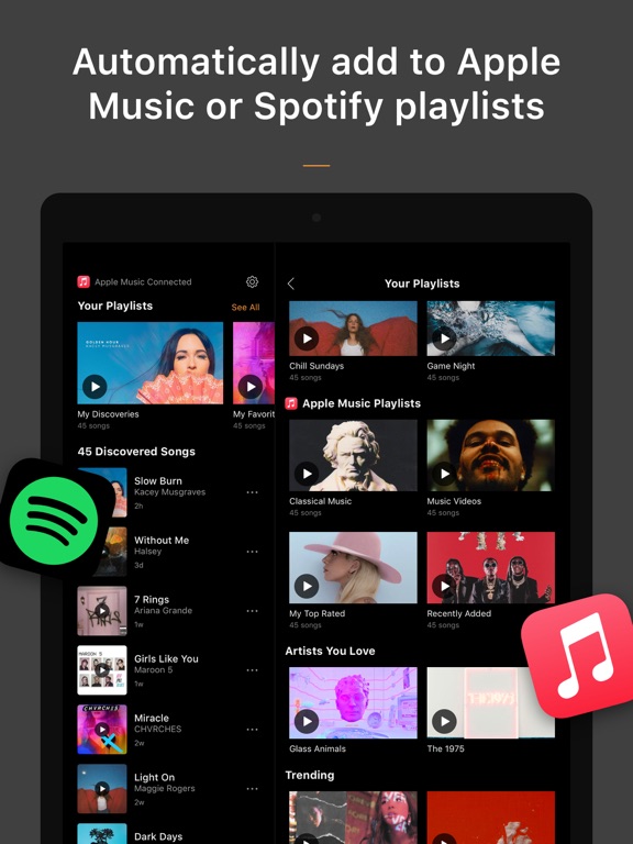• Build personalized playlists through Apple Music or Spotify (SoundHound account and music subscription required)
