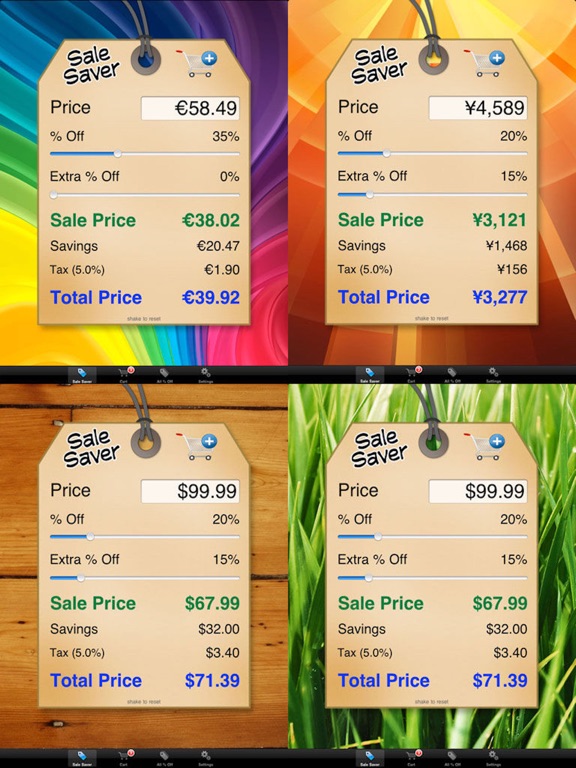 Sale Saver is friendly for the world market, with international currencies available. It is also customizable with a variety of fun backgrounds to fit your mood - choose one of the many built-in options or choose one of your own photos from your photo library!