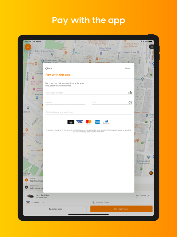 Enter your credit card details for quick, secure payment from within the 13cabs app.