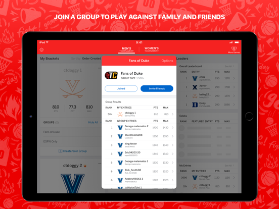 - Create up to 25 brackets and enter each bracket in up to 10 different groups to play against friends, celebrities, ESPN personalities, and fans across the nation.