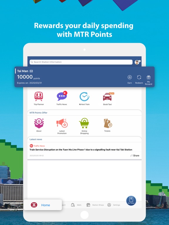 Introducing the brand new “MTR Points” on MTR Mobile, which allows you to easily earn points from daily travel, or while spending in MTR Malls and Station Shops, buying any MTR souvenirs or tickets via MTR Mobile. Accumulated points can be redeemed for free rides and other rewards.