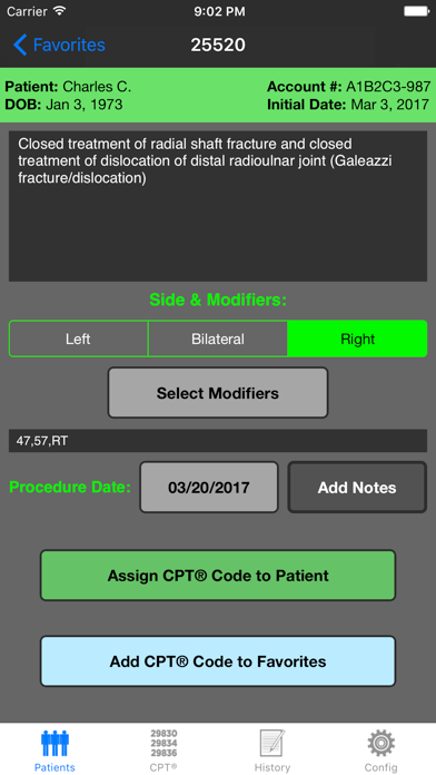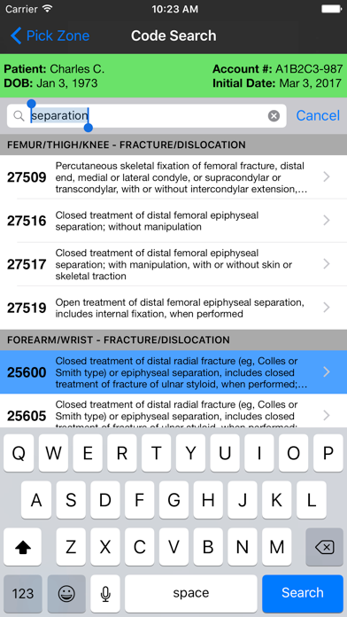 Mobile Coder Orthopedics includes a comprehensive set of CPT® codes used by general orthopedic surgeons, foot specialists, and hand specialists. You can apply modifiers to your codes, and also use the same code multiple times for the same patient - great when more than one toe or finger is operated on, for example. In short, Mobile Coder Orthopedics offers the most complete list of codes and time-saving features currently available for use by any orthopedic surgeon.