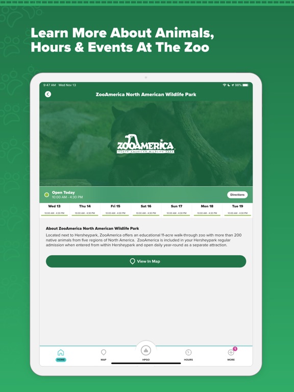 Maximize your Hersheypark® experience with The Official Hersheypark Mobile App! Find information on rides, attractions, entertainment, food, shopping, and more for Hersheypark, ZooAmerica® North American Wildlife Park, and Hershey's Chocolate World Attraction. Plus, navigate through the Park with our customizable map and create an HPGO account to view personalized ride stats and ride photos.